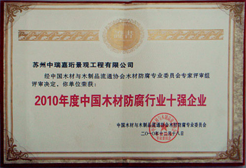 2010木材防腐行業(yè)十強(qiáng)企業(yè)證書(shū)